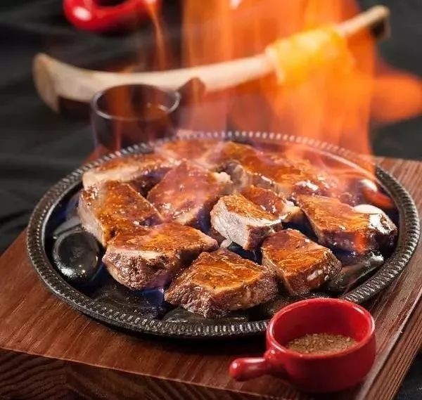 2、客人点餐时,将牛肉块蒸至热透,用卤汤原汁烩一下,放在烧热的铁板和石头上,淋黑椒汁,配椒盐、黑椒汁,洒白兰地酒,上桌时点火即可。