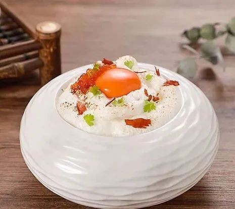 2. 蛋清加糖粉和盐入高速搅拌器打成蛋白霜,打发后装盘,进烤箱180度4分钟烤制上色拿出,分子蛋黄和鱼籽米醋装盘即可。