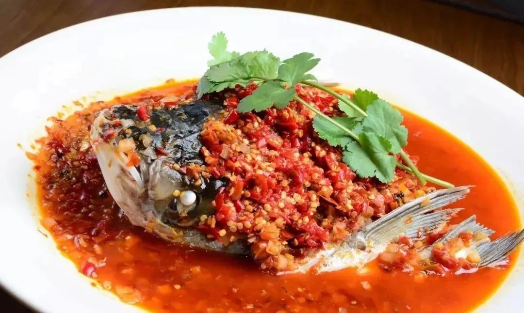 4.往锅里倒入色拉油烧热,投入自制泡红辣椒煵香后,倒入泡姜粒、泡萝卜粒、野山椒碎和泡大蒜粒炒香,掺入适量事先熬好的鱼骨汤烧沸,调入盐、味精和鸡精,起锅后均匀地浇在盘中鱼头上。5.把淋上料汁的鱼头送入蒸柜,大火蒸约15分钟至鱼肉熟,取出来淋入少许山胡椒油,以香菜点缀,即成。