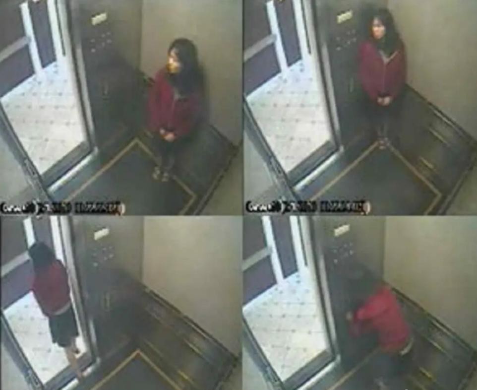 十秒后,兰可儿跳出电梯,将头探出电梯查看,然后立即返回电梯内的死角,继续僵硬地站立。