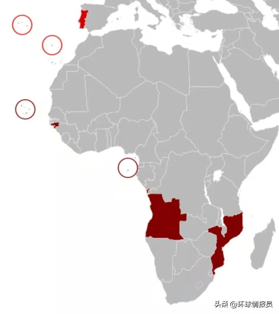 ▲“康乃馨革命”后的葡萄牙(红色)与纷纷获得独立的葡属非洲殖民地(深红色)