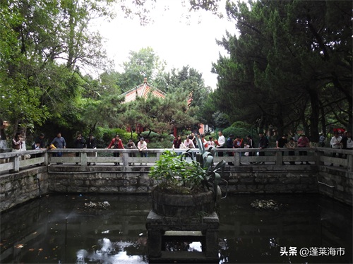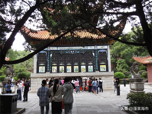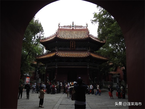 沿主甬道北行,可见重檐歇山顶的方形奎星阁。奎星阁又称盘龙亭,构造比较独特,高起的基座上南北开有一个拱券式门洞,游人可以从中穿过。奎星阁的南北两面各有8扇隔扇门,中间6扇稍小,两边的两扇稍大。隔扇门下部均以彩绘戏剧故事装饰。南面顶层檐下悬“奎星阁”竖匾,梁枋下面悬“戏台”二字匾额,原来这奎星阁同时还是座戏台,怪不得以戏剧故事装饰隔扇门。匾额两侧有抱柱联“亭中盘龙何不在天飞霹电;岳有集凤都来此处听箫韶”。奎星阁背面的匾额为“古往今来”,对联“凡事莫当前看戏不如听戏乐;为人须顾后上台终有下台时”富有哲理,耐人寻味。奎星阁的石砌底座是空腔的,加上拱券式门洞,可以营造出优良的声学效果来助力唱戏,显露出古人的智慧。