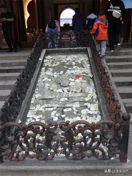 门前的丹陛石应该是个老东西,浮雕图案已经有些模糊,现在已经被铸铁护栏保护起来。不知道是什么说道儿,这块丹陛石上被扔了许多纸币,面额多为1元,也不乏50元大票,甚至还有人扔了个红包,但没看出来包了多少钱。御书楼内原来藏有历代帝王御赐匾额、春秋大祭时的官方祭文、祝文等珍贵文物,可惜都在非常年代被毁。现在这里被辟为“南岳历史人文博物馆”,同时也是“南岳文物商店”。
