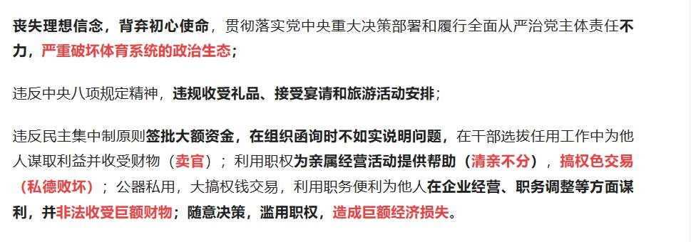 中纪委的双开通报内容中,查实他:破坏体育系统政治生态;卖官;权色交易;大肆受贿!