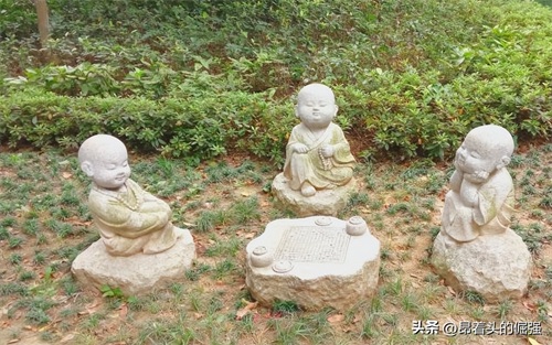 进了山门,一个四四方方的明镜湖,映入眼帘,这里是进入寺庙的必经之处,湖上有观音石像和六角亭,在湖边还有青铜经文巨型雕塑,在阳光照射之下闪闪发光,显得非常神圣,有种进入净土的平静感,心灵也得到荡涤。