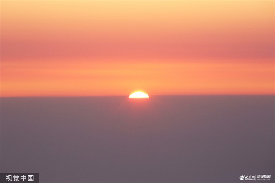 大众网·海报新闻泰安12月10日讯 2019年12月8日,山东泰安,初冬的泰山景色别致,吸引了众多游客前来游玩。图为泰山山顶的日出盛景。图片作者:郭志华/视觉中国