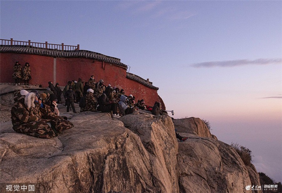 大众网·海报新闻泰安12月10日讯 2019年12月8日,山东泰安,初冬的泰山景色别致,吸引了众多游客前来游玩。图为游客在泰山山顶欣赏日出盛景。图片作者:郭志华/视觉中国