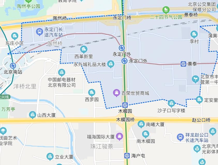 木樨园站北面在东城区、南面却在丰台区,它不仅地跨丰台、东城两区,而且这个站点的西侧是百荣世贸商城,也是东城区(原来崇文区)一个宏大的建筑。