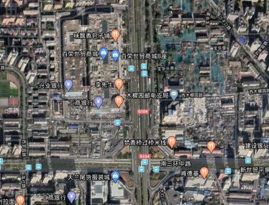 北京地铁8号线的木樨园站附近的地图如下所示,这个地方的西侧是百荣世贸商城。