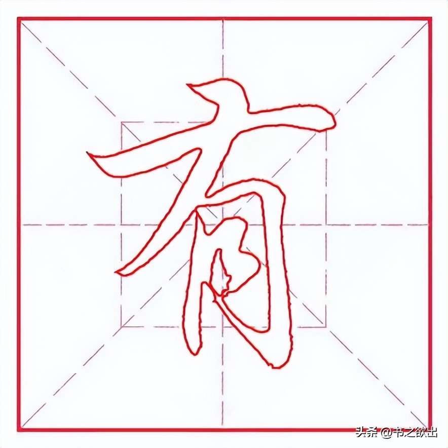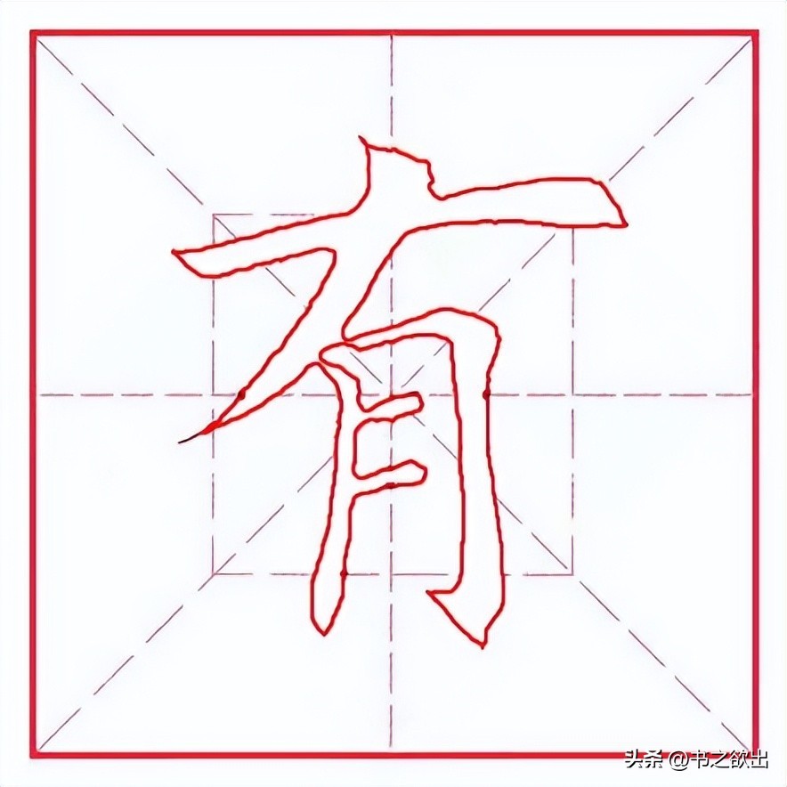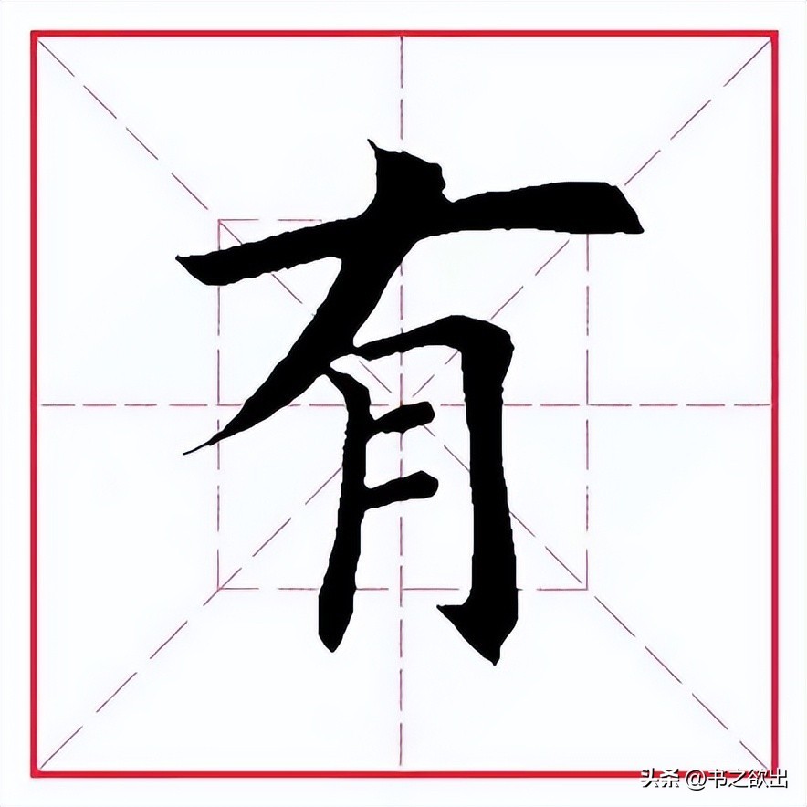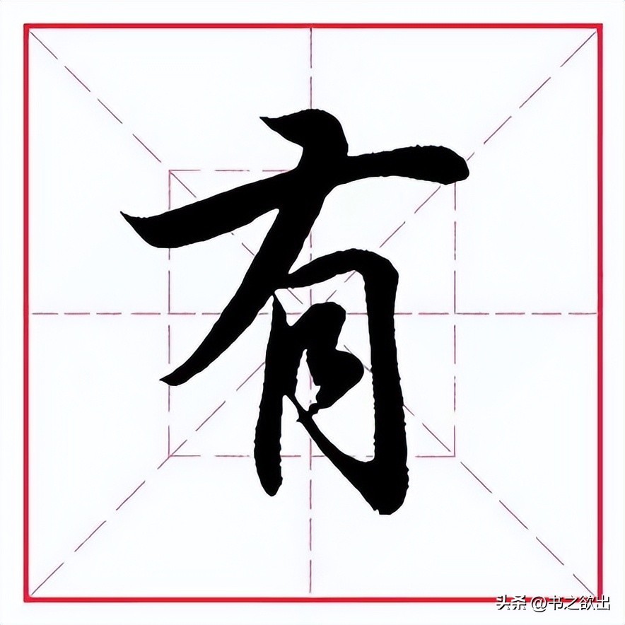 “有”字笔顺先写撇画,稍厚重。以斜切落笔,然后转锋向左下行,注意行笔的角度,撇身稍直,过撇肚后再稍带弯度向左快速提锋撇出,力达撇尖;横画起笔与撇画的收笔基本平齐,稍抗肩,不宜厚重,压撇脖处而过,过撇画后行笔略平,略呈拱形。