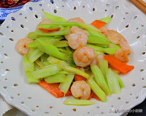 另起锅烧油,放入姜片,炒香,之后放入西芹和胡萝卜,还有虾仁,翻炒均匀,加入食用盐,鸡精,味精,翻炒均匀,边翻炒边放入水淀粉,来勾个欠就可以,出锅前我们再放点料酒去去腥气就可以啦。