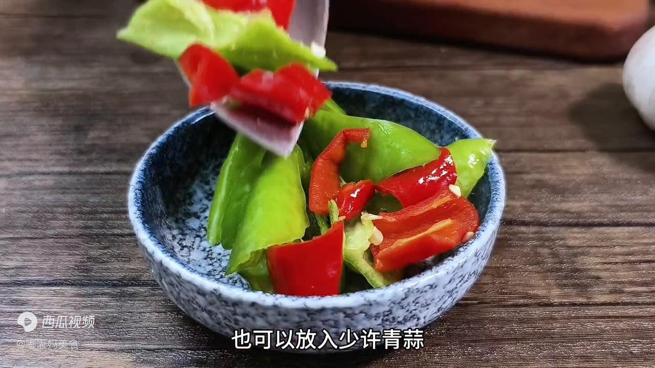 2. 准备少许配菜,青红辣椒切成滚刀块,也可放少许青蒜,小碗中加入蒜姜末、一大勺剁碎的郫县豆瓣酱、一小勺甜面酱。