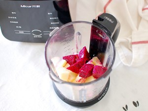2、火龙果和苹果洗净去皮切成块状,直接放入破壁机的搅拌杯