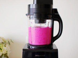 5、启动"真空果汁"程序开始搅拌,3分钟,一杯低卡又营养的火龙果奶昔就完成了~~快速打出一杯细腻的果蔬汁是所有破壁机都能做到的,而要做到久放不氧化、不分层,则是真空破壁机区别于普通破壁机的最大特点喔