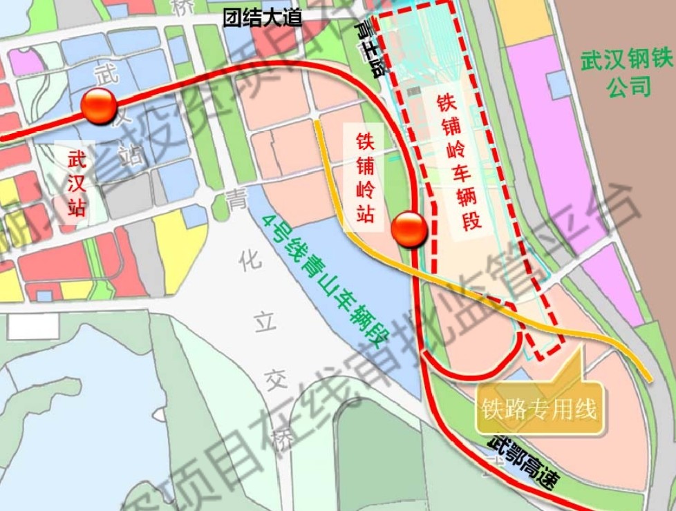 3)铁铺岭站:站位于青山车辆段东北, 青王路与规划路交叉口,车站为地下二层双岛式