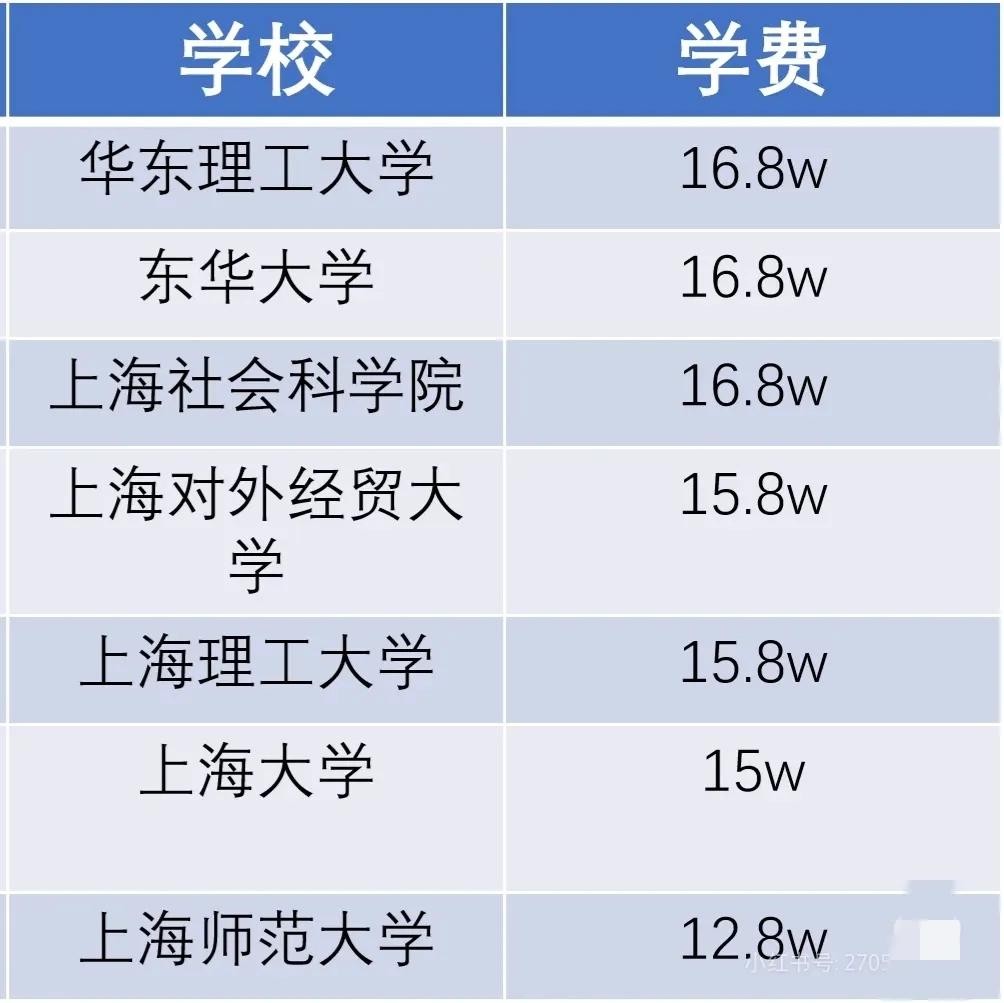除此之外,同济大学,上海交通大学、华东师范大学,上海外国语大学金融专硕的学费接近20万元。当然,华东理工大学、东华大学、上海科学研究院、上海大学,上海理工大学,上海对外经贸大学金融专硕学费大约在16~18万元左右。
