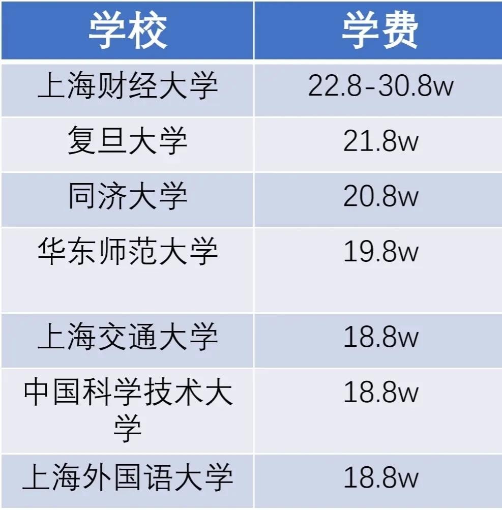 从上图来看,上海财经大学金融专硕学费在22万~30万元左右,这也是上海高校金融专硕最高等级。除此之外,复旦大学金融专硕21.8万元人民币,但网络据传2025年复旦金融专硕要上涨到25.8万元。