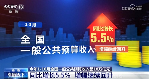 央视网消息:财政部18日公布了前10月财政收支情况。数据显示,10月份,全国一般公共预算收入同比增长5.5%,增幅继续回升。