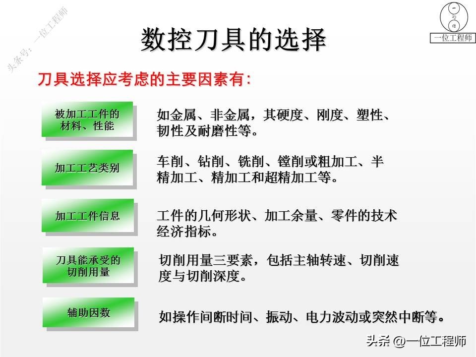数控刀具选择应考虑的主要因素有:加工工件的材料、性能;加工工艺类别;加工工件信息;刀具能承受的切削用量;辅助因素,如操作时间、振动、电力波动或突然中断等。