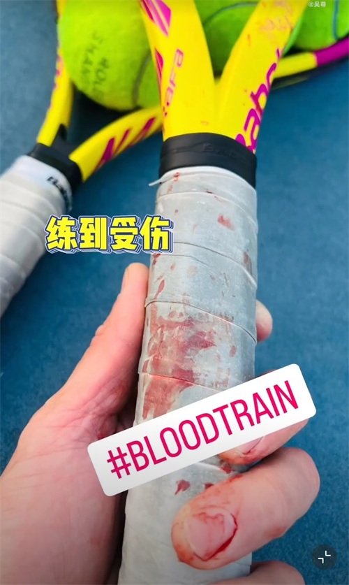 然后吴尊给自己的球拍一个特写,缠绕着白布的球拍上,居然有着大片血迹,再仔细观看下,原来是吴尊的手指手上流血,自己打球都能把自己伤成这样,足见吴尊的努力了。