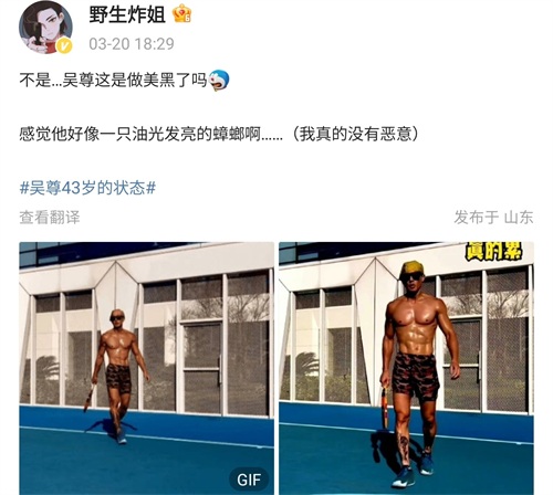 3月20日,43岁的知名演员吴尊在个人账号上分享一组自己打网球健身视频,视频里吴尊赤裸上身,只穿了件沙滩短裤,阳光自信的硬汉模样,引发了网友的热议。