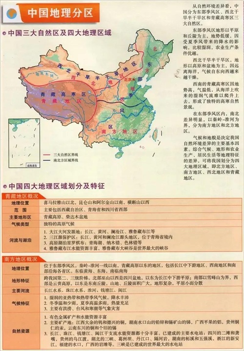 中国四大区域:西北地区、北方地区、南方地区、青藏地区四大地形区域。