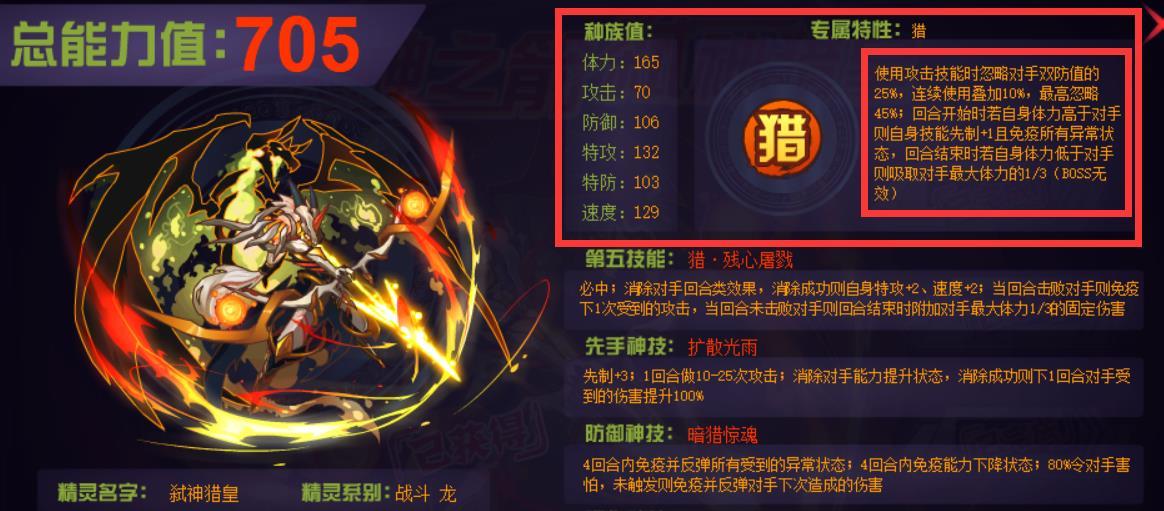 【暗猎惊魂】必中;4回合每回合免疫并反弹所有受到的异常状态;4回合自身不受能力下降技能影响;80%令对手害怕,未触发则免疫并反弹对手下1次造成的伤害;弹控外加属性控场,未触发免控并且上盔。这就算是猎皇的两大核心属性技能了,比较重要,但靠两个属性技能互相苟还是很强的。