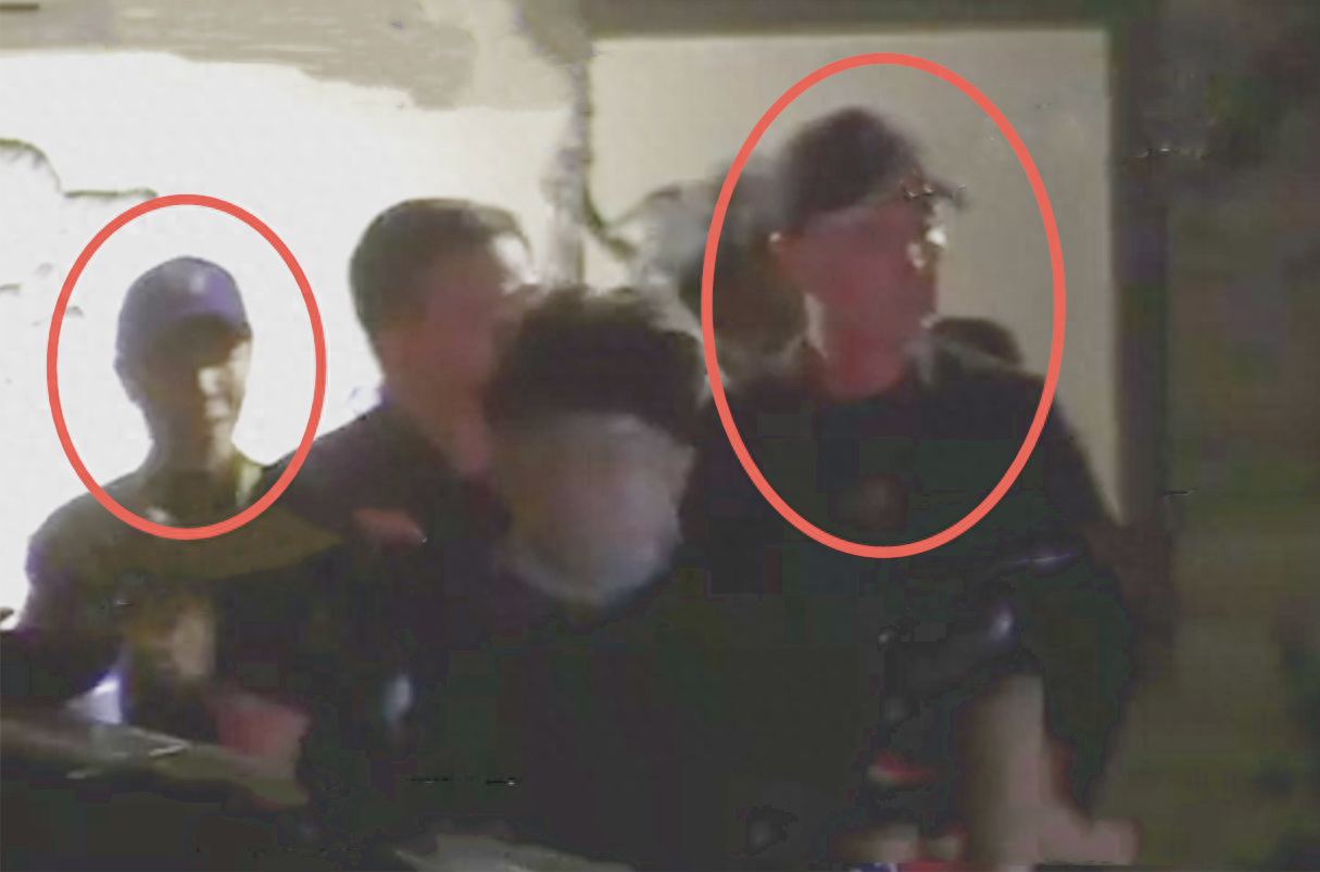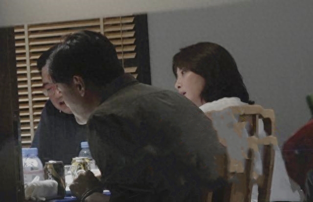 画面中,几人一起坐在餐厅包间里,吴刚穿着黑色T恤,脸上微微发红,不知道是不是因为喝了点小酒,略有微醺。旁边岳秀清戴着蓝色棒球帽,侧颜也很漂亮,两人并排坐在一起,夫妻脸明显。