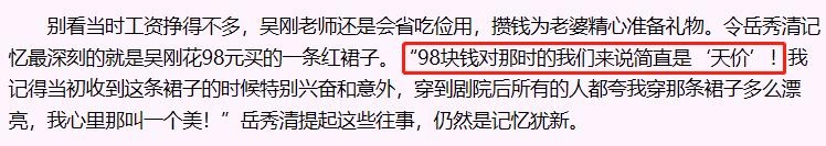 当时的工资都不高,但吴刚经常请她吃冰淇淋,甚至还省吃俭用买了条98块的红裙子,几乎就是天价礼物,这让岳秀清很感动。