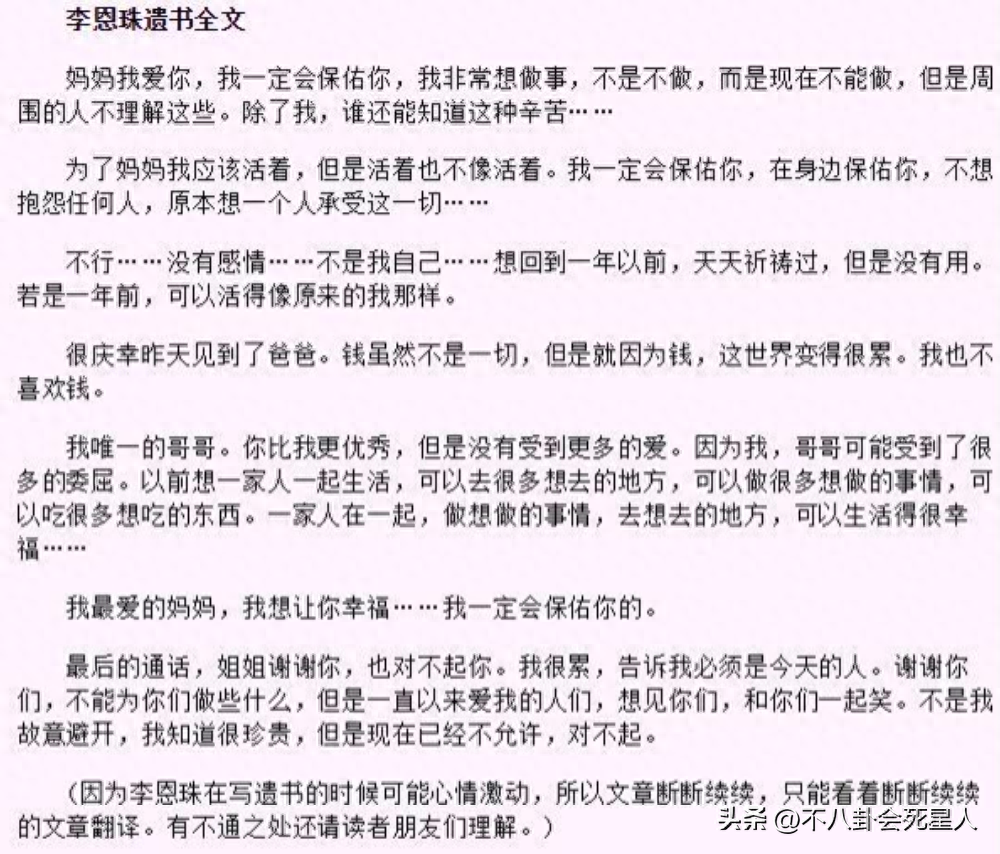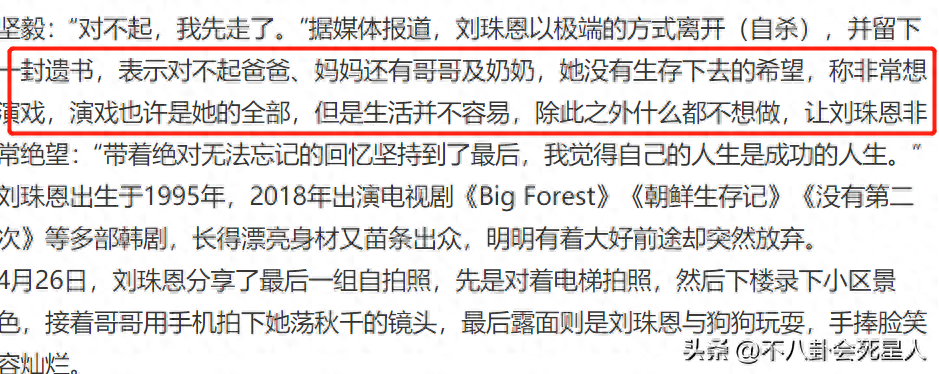 刘恩珠哥哥还公布了妹妹的遗书内容,在信里,年仅27岁的刘恩珠表达了对生活的绝望,与对父母家人的爱,并且希望大家不要为她的离去感到悲伤。