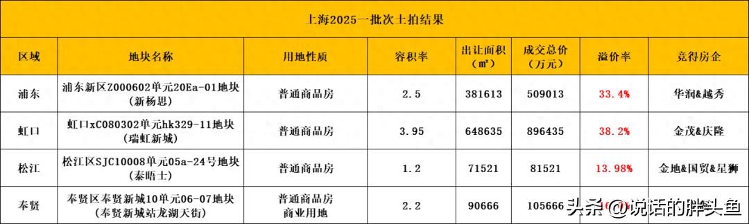 今天,上海2025年第一批集中供地正式开拍,共出让4幅宅地,虹口区、浦东新区、奉贤区以及松江区各1幅。