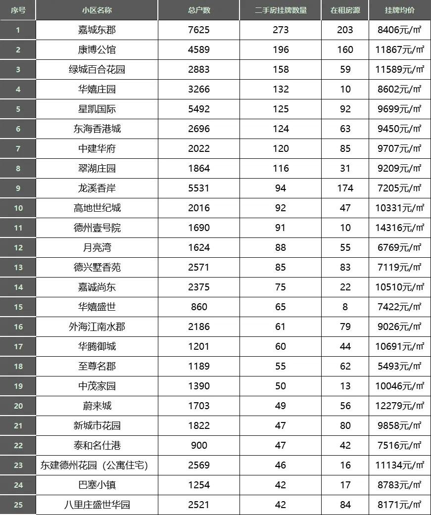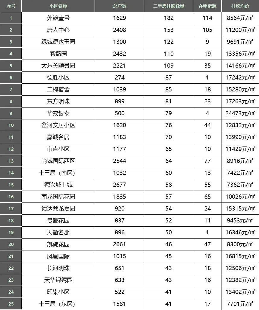 德城区二手房挂牌约3867套,共计约539个小区,挂牌数量排在前25位的小区,其中大多以学区房为主。