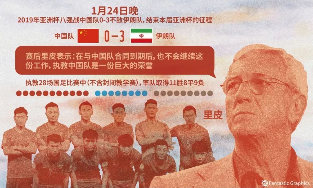 Under Lippi's guidance since October 2016, China's national team won only 10 of 30 games, including the team's latest crushing 0:3 defeat to Iran at the 2019 Asia Cup's quarter-final a week ago.