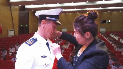 妻子为丈夫戴上新军衔