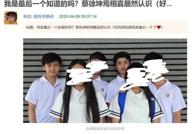 就在4月14日,有网友扒出他们童年时的班级合照,因此猜测他们就是同班同学。乍眼望去,蔡徐坤所在的班级女生居多,作为男生的蔡徐坤在一众女生中就特别亮眼,个子高挑的他,站在合照中的最后排,头身比例优越,他的脸甚至比很多女孩子还要小。可能没有注重修剪头发,蔡徐坤的发型好像“炸毛”了一般,一脸呆萌目视前方,腰板挺直十分出众,可爱至极。