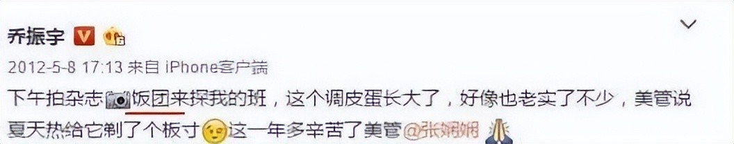 2021年12月份,王丽坤发布了一个话题“想我的饭团了”。次年,乔振宇发表“下午拍杂志,饭团来探我的班……”