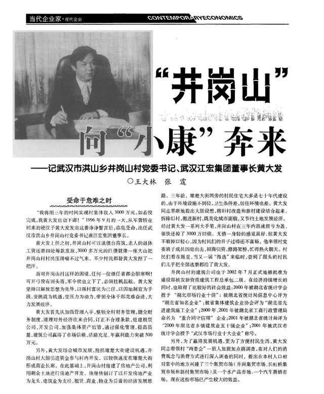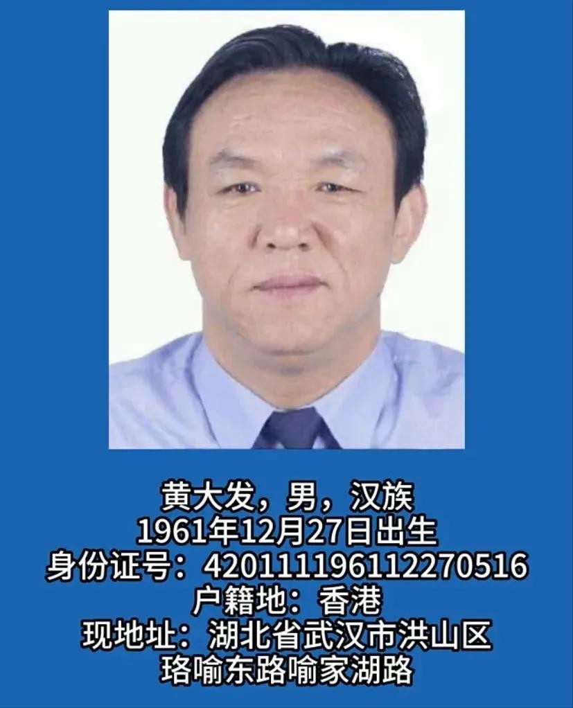 黄大发,1961年生,男,汉族,现在62岁,家住在武汉市洪山区,1996的时候就任洪山乡井冈山村党委书记兼江宏集团董事长