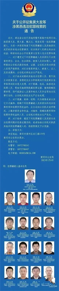 2023年5月6后,湖北黄冈是公安局对外发布通告,公开征集黄大发等涉黑恶违法犯罪线索。这意味着,这个拥有数十亿身家的黑社会组织头目,曾经逍遥法外长达七年之久,盘踞武汉多年,黑白两道都混的“风生水起”,祸害百姓已久的“黑老大”终于落网。