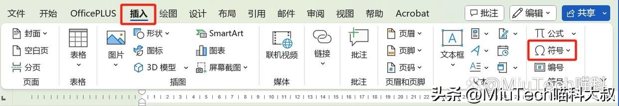 这个方法基本适用于大多数特殊符号。以Word文档为例,打开一个文档,在上方菜单栏选择插入,找到并点击符号: