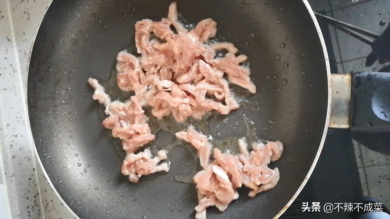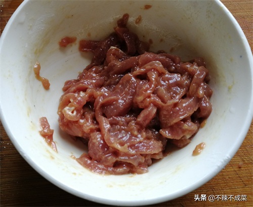 第三步:油炸豆角的等待过程,可将猪瘦肉洗干净,切成片,放入碗中,加入少量的油、酱油、鸡精、少量生粉搅拌均匀;豆角炸好后,锅中留油底油,放入姜爆香,再放入瘦肉炒至变色,继续炒10来秒后倒入碗中待用;