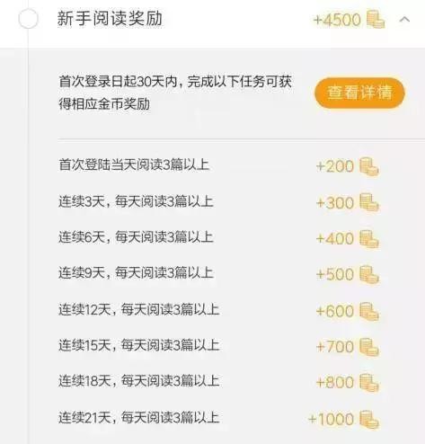 在账户页面中,“每天免费抢1万现金”“阅读3分钟得奖励”“高温补贴礼包”等奖励信息不停滚动。系统还提供了新手任务和日常任务等奖励:新手每天阅读3篇以上新闻,可获得200~1000金币,优质评论奖励200金币,分享到朋友圈奖励90金币……
