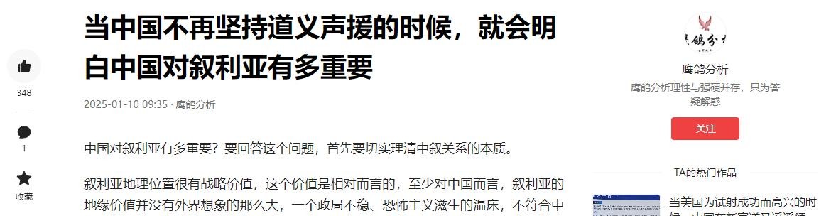 鹰鸽分析2024-01-10当中国不再坚持道义声援的时候,就会明白中国对叙利亚有多重要
