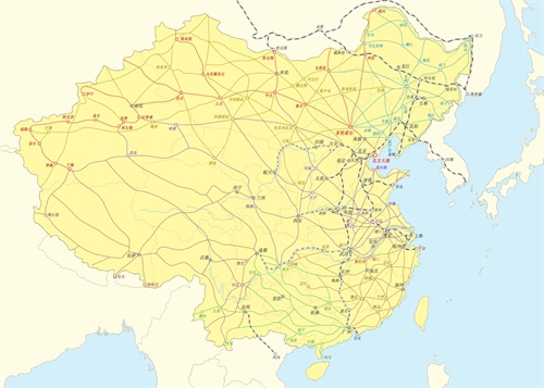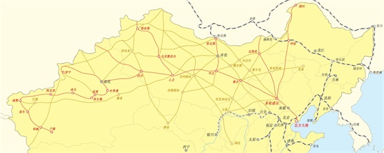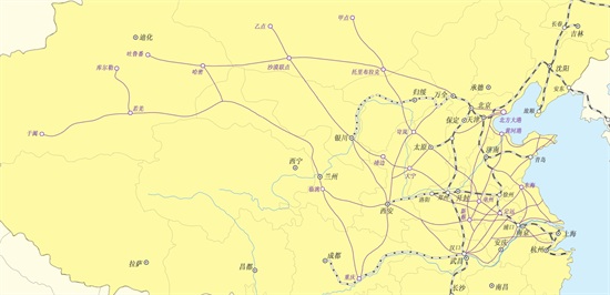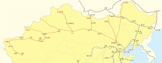 向东经大兴安岭抵达漠河;向北穿过蒙古与俄国西伯利亚铁路相接;向西沿沙漠北境至新疆乌鲁木齐,而后经天山进入塔里木盆地;再以十余条支线串联沟通,最终建成总里程11200公里的西北铁路系统。在此基础上,增筑25600公里的扩张西北铁路系统。