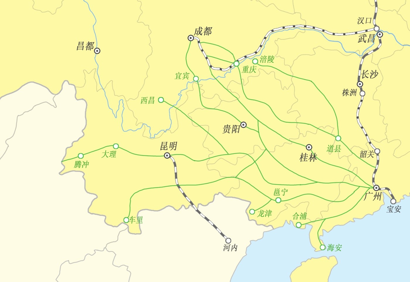 当时的中国仅有京汉、津浦等少数几条通车的铁路,湖南、四川、广东、广西、云南、贵州西南六省除了一条法国人运营的滇越铁路外,只有一条尚未打通全线的粤汉铁路,所以孙中山计划建设总里程超一万公里的西南铁路系统,“由广州起,向各重要城市、矿产地引铁路线,成为扇形之铁路网,使各与南方大港相链接。”