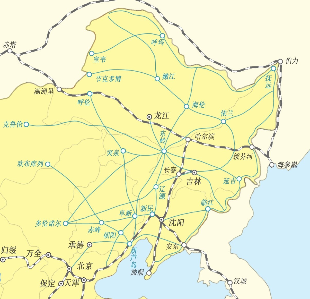 东北铁路系统,包括满洲之全部及蒙古、河北一部,共20条线路,总里程14400公里。