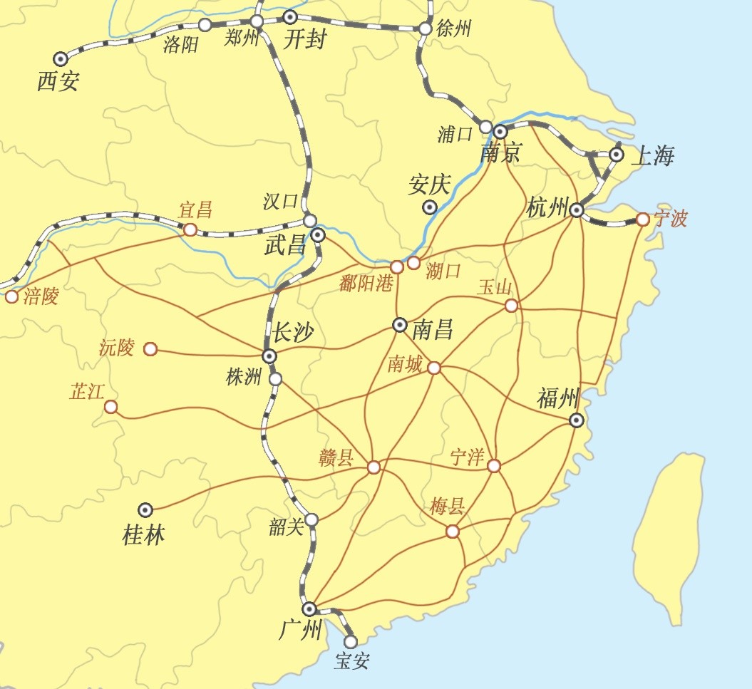 东南铁路系统,包括东南沿海地区及苏、皖、鄂、湘一部,共13条线路,总里程14400公里。