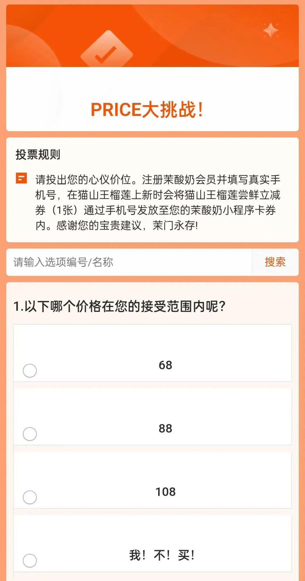 2025 年 7 月,茉酸奶布了一个问卷,针对新品猫山王榴莲酸奶奶昔征求价格,起步价是 68 元,紧接着还有 88 元和 108 元的选项。