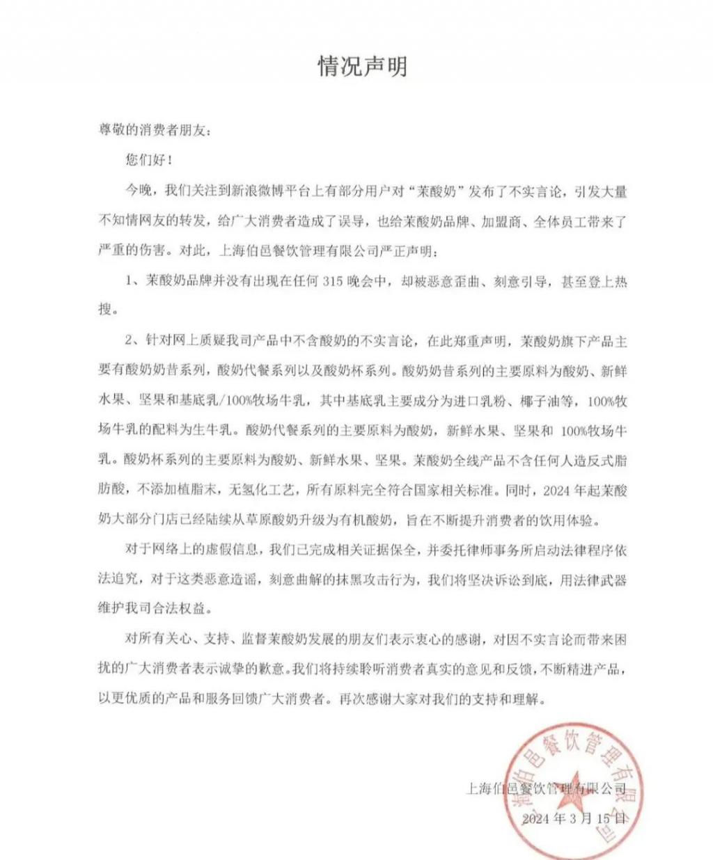 这一次在遭到上海市消保委点名后,茉酸奶于 3 月 16 日凌晨在公众号回应表示,酸奶奶昔系列的主要原料为酸奶、新鲜水果、坚果和基底乳 /100% 牧场牛乳。并且,全线产品不含任何人造反式脂肪酸,不添加植脂末,无氢化工艺,所有原料完全符合国家相关标准。