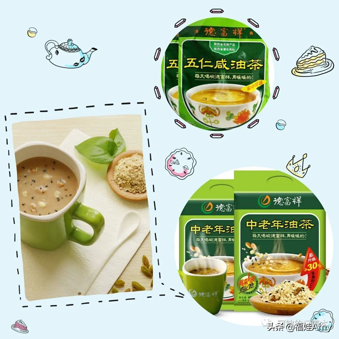 陕西我知道的能论的上是有品牌的油茶,大概算是“德富祥”了吧,是专业从事传统清真食品研究、开发、生产和销售的现代化企业。印象中,小时候逢年过节走亲戚,基本都送油茶,五仁咸油茶、中老年油茶。在我家油茶几乎都是被我一人承包的,管它什么中老年的,我通吃,每次都冲的稠稠的,一勺一勺,像剜吃豆花一样,那种感觉妙不可言。
