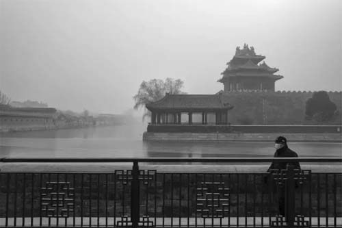 雾霾笼罩下,一位行人戴着口罩路过皇城角楼。